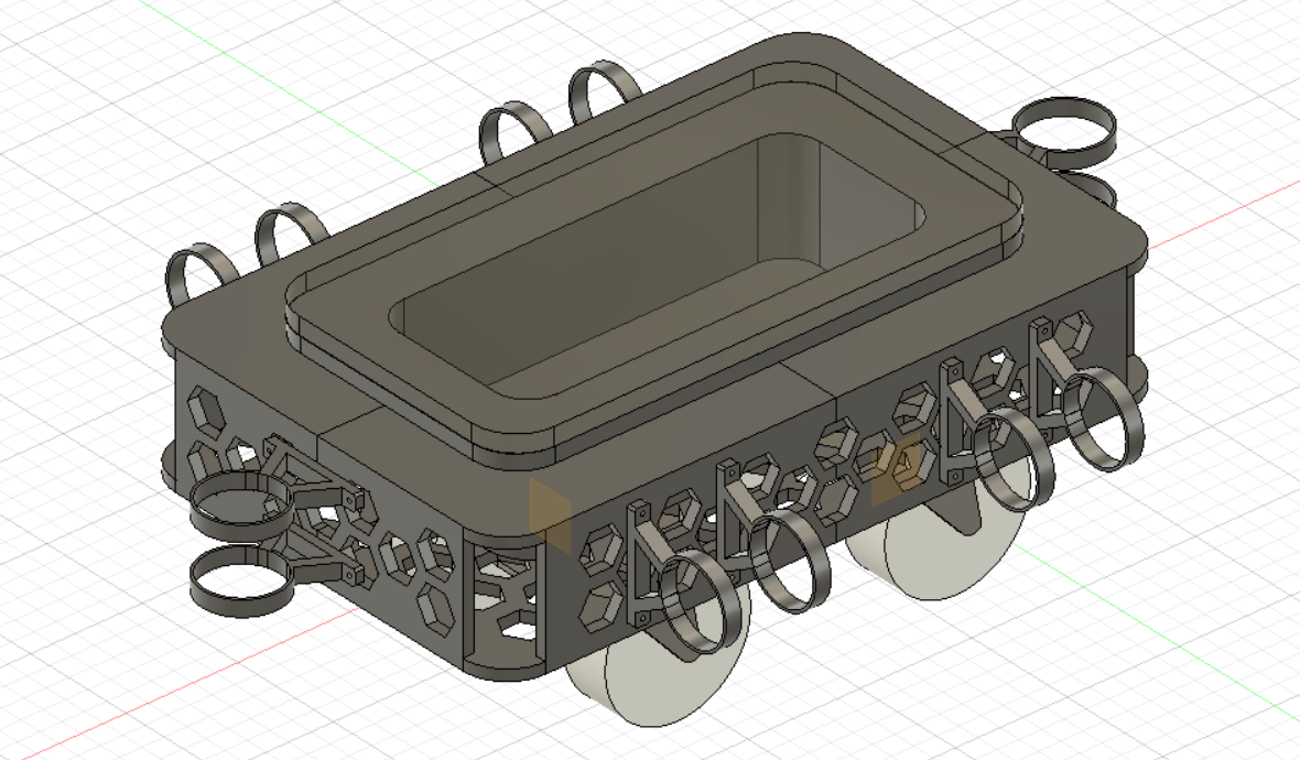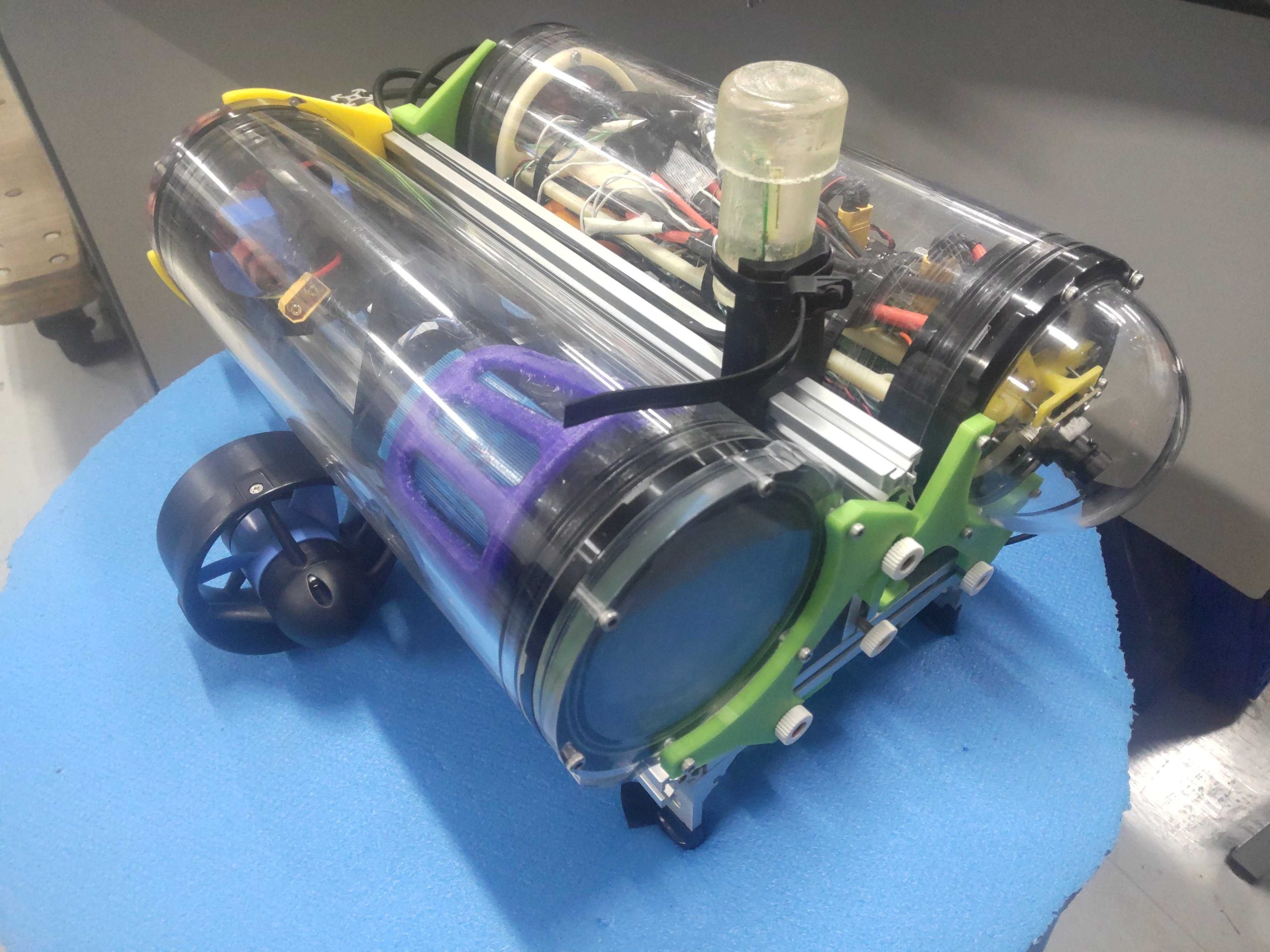 | 3基のアジマススラスタを搭載したKurioneシリーズの三代目となります.初期型のKurione1に比べるとスラスタの取り付けや防水方法,容器内レイアウトの改善により運搬やメンテナンスの効率が大幅に向上しています.中でも防水容器は,市販のアルミパイプをロウ付けすることで製作されており,高い防水性と放熱性を両立しました.機体に取り付けられたLED装飾で機体の位置や姿勢を示すとともにロボットの動作状態をデバッグしやすくする狙いがあります. |