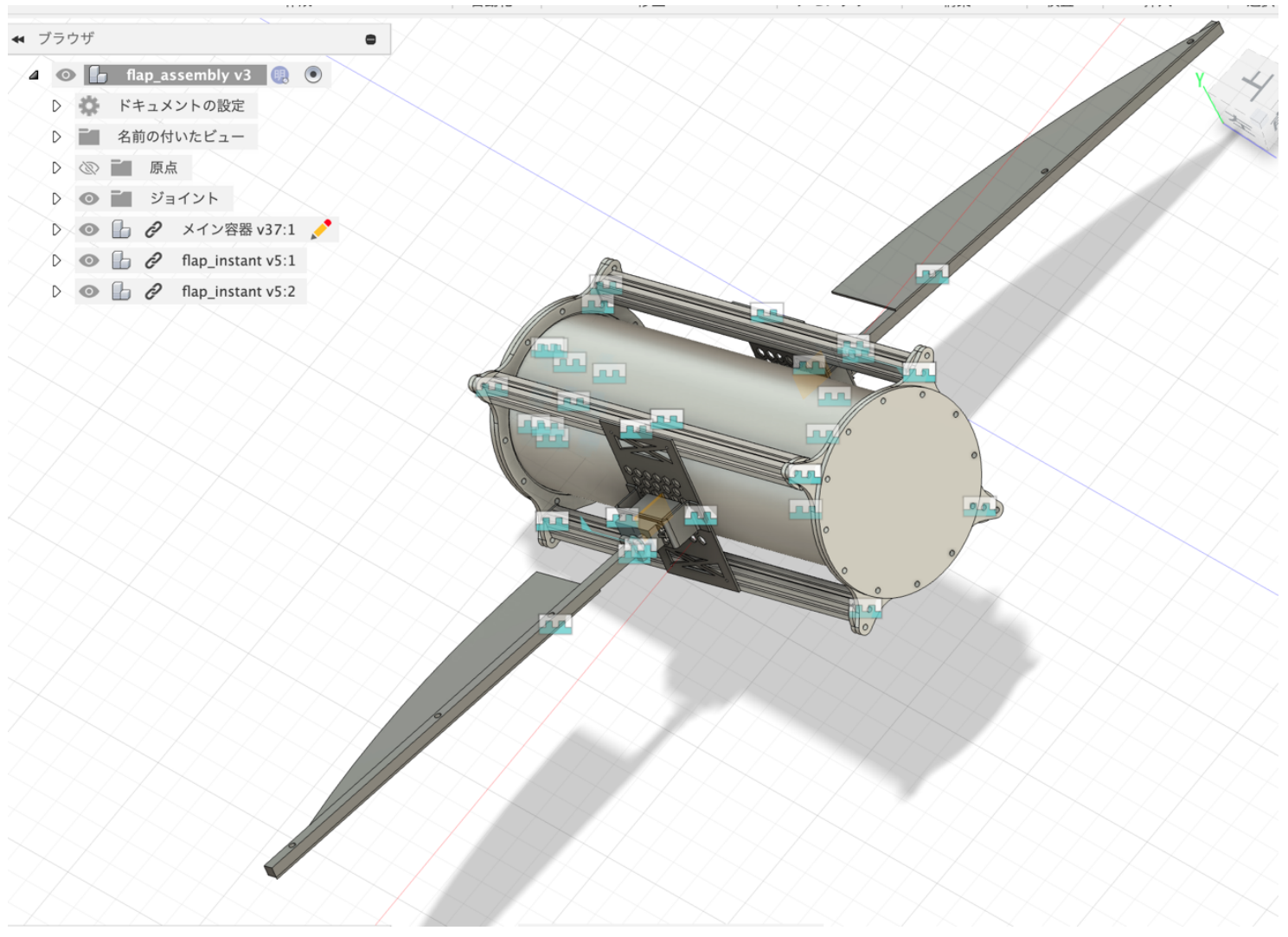 | 水中において、一つのスラスターと羽の組み合わせによって三次元的な軌道を実現させようという試みであり、これを遂行するために最低限の機能を持った試作機としての位置付けの機体である。 この大会では、上下の旋回とスラスターでの前、後進、バランスの取れた浮力調節が実現できることを目標に制作している。また、この機体は外付けアタッチメントの取り付けが可能になるように、外部に加工可能なフレームを残すように作られている点が特徴である。 |