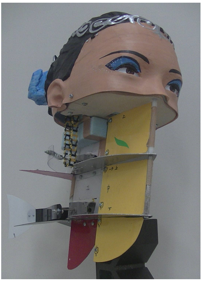 | 水上を優雅に泳ぐスイマー(シンクロ選手をイメージ)を模した魚ロボットです.ロボットの上部には PLA 製の人間の半頭部の模型が取り付けられ、ロボットの下部は尾ヒレ推進の魚ロボットになっています.今回は楽しめる魚ロボットをとして見た目のインパクト,静かで優雅な遊泳動作に着目し,浅瀬でも優雅に泳ぐスイマーを表現に挑戦しました. 推進方法は魚を模倣した尾ヒレの揺動運動です.アイデアとして上下二段に尾ヒレを配置し,それらを180度位相で動作させることによって,左右の揺れが軽減され滑らかな遊泳動作を実現しています. |