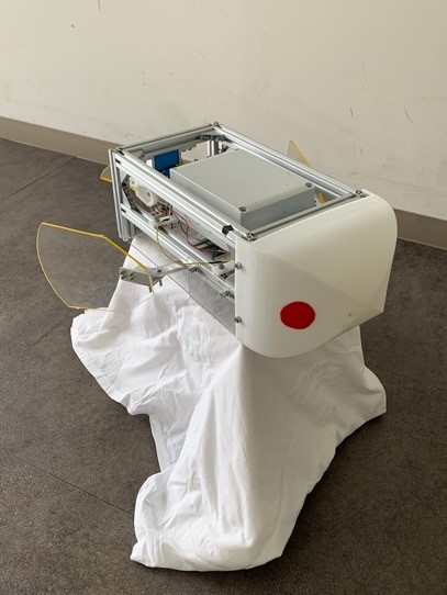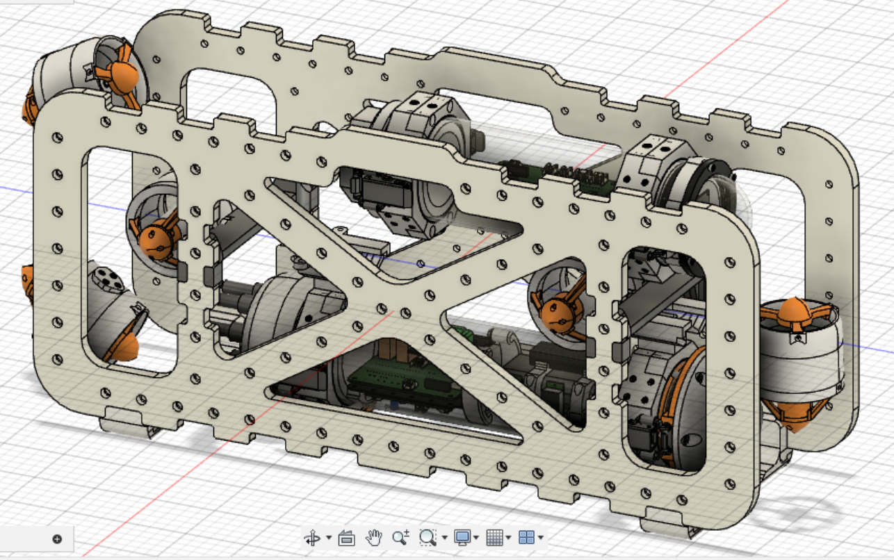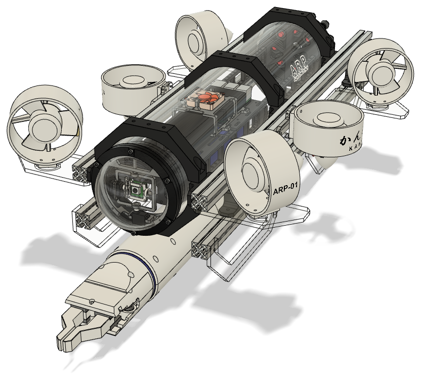 | スラスター6基と2自由度マニュピレーター、カメラを装備した有線操縦型の水中ロボット。ハル内部については、マイコンやバッテリーなどの内容物を、等間隔に穴の開いたフレームにトレイを載せるような構造になっており、センサや機器の追加・変更や配置修正を気軽に行える。ハル外側もスラスターの位置や角度を細かく調整することを前提とした構造にした。また、ハル内部には検水センサなどを取りつけ、迅速な異常検知によるロボットの保護機能も有する(予定)。 |