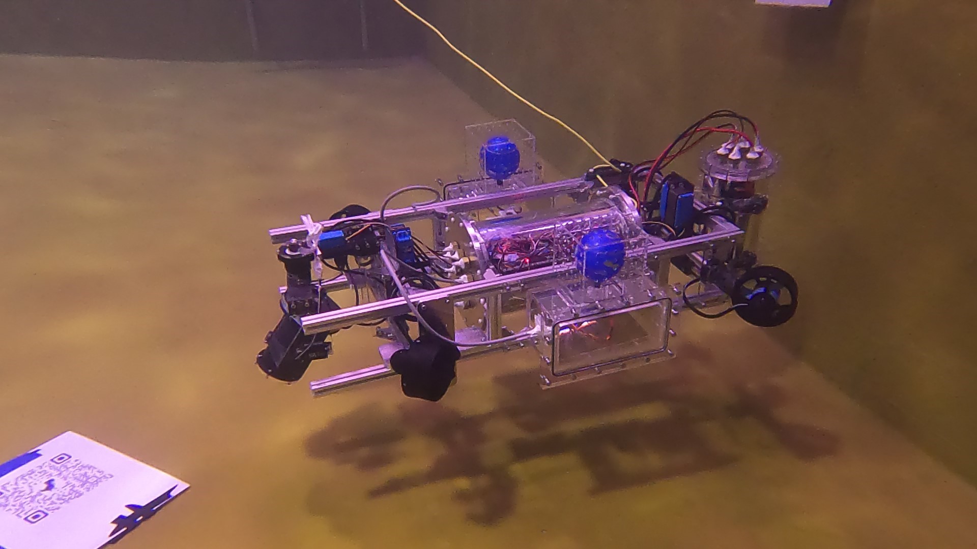 ROVは人がリアルタイムで操縦を行う水中ロボットである。操縦者が絶えず操縦する必要があるため長時間操縦する必要がある場合や複雑な内容の作業を行う場合、操縦者にかかる負担が大きい。操縦がより単純であるほど操縦者にかかる負担が少ない。そこで、カメラジンバルを操縦者が装着するHMDの動きと連動させカメラジンバルの操作を直感的に操縦できるようにした。 また、スクリューは1個あたりの消費電力が最大で16V24Aと消費電力が大きい。しかし、6自由度の動きを実現するには、通常6個以上のスクリューが必要である。本機体では、スクリューを4個、前2個、後2個をそれぞれ別々のサーボモーターで推力の方向を変える推力偏向機構を搭載した。この推力偏向機構とスクリューの回転方向をモードによって切り替えることで、低価格かつ低消費電力で6自由度の動きを実現した。 |